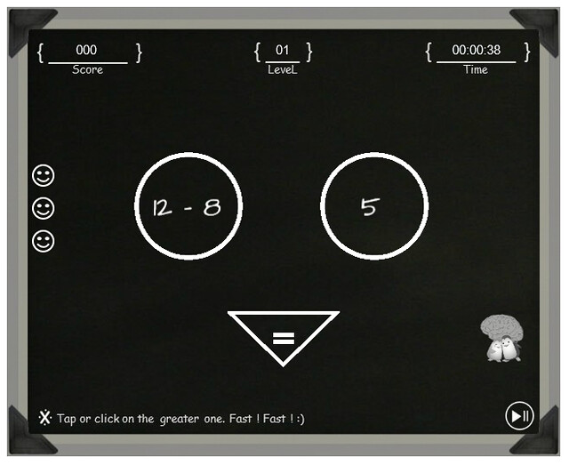 Two numbers will be displayed on the screen either as an integer or by a simple math relation. The user is prompted to choose the greater one. The complexity of Math relation increases with increase in levels.