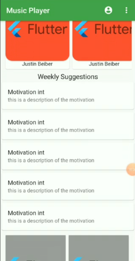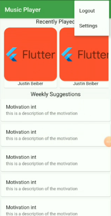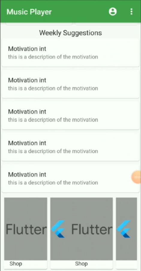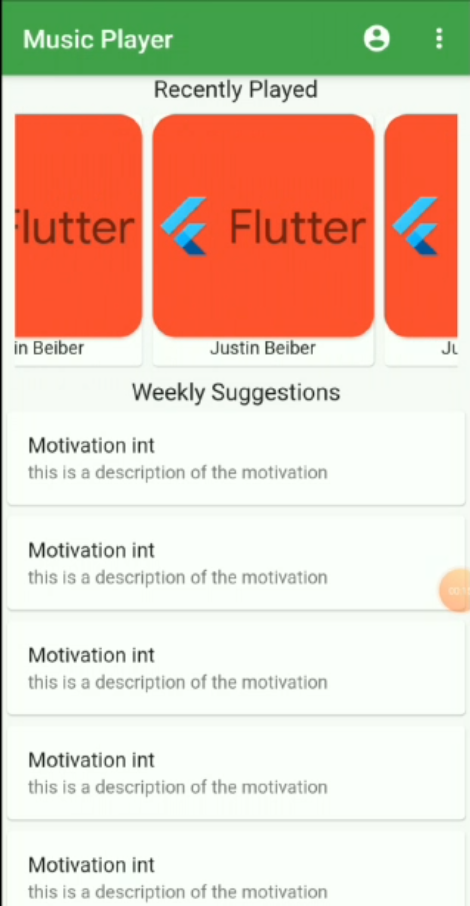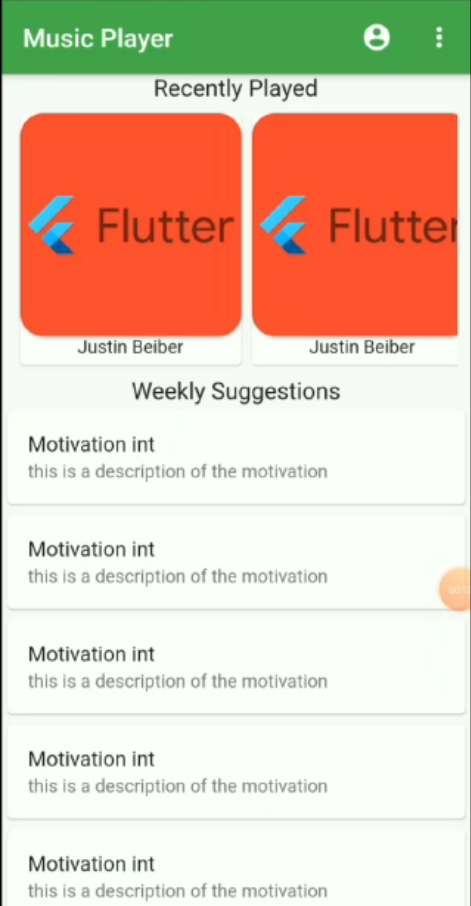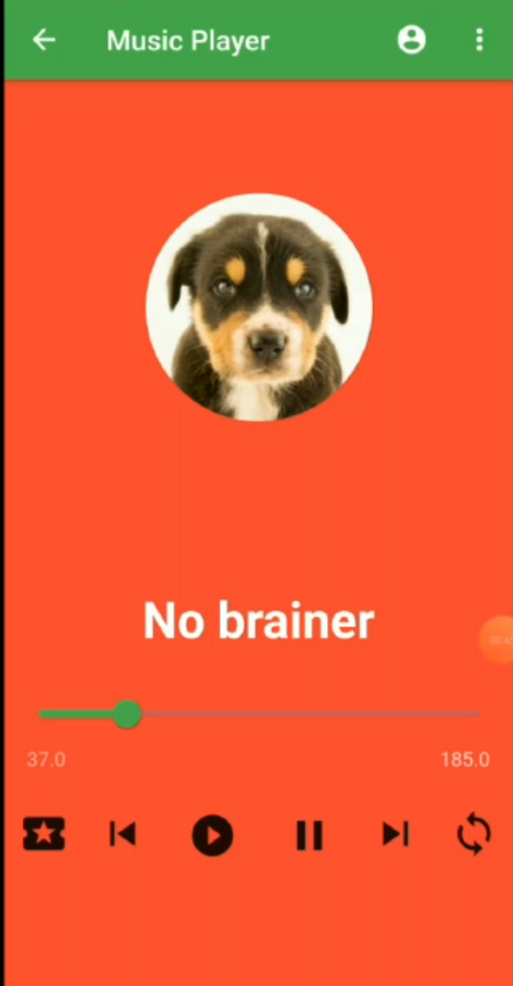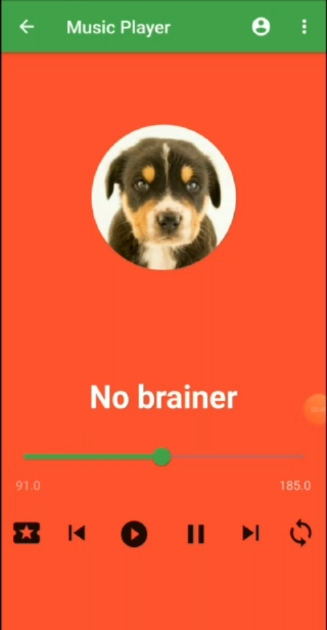 As the app is opened a splash screen is shown for the first 3-5 seconds depending upon your loading time. After this next screen which has the list of the song is displayed. The list is horizontal as well as vertical scrollable at some parts. When you click on any of the List item or the cards displayed, another screen will appear with an image of the song displayed and the song being played. There is a condition in this like if there is an 'x' song playing and you click on the card of 'y' song then x song will stop and y song will start playing. A slider, song duration, and current position in the song will also be displayed which will be changing each second. Below these, we have a six icon buttons for liking the song, playing next and the previous song, playing and pausing the song and for playing the song in a loop. Out of the six mentioned icon button only two of these which are play and pause work currently. You can change the song duration by sliding through the slider.