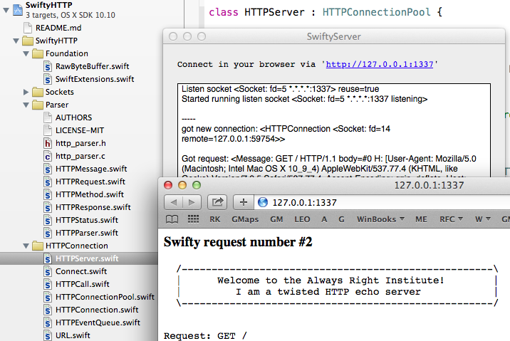 As a bonus - this also has a tiny Connect class - which is modelled after the Node.JS Connect thingy (which in turn is apparently modelled after RoR Rack). It allows you to hook up a set of blocks for request processing, instead of having just a single entry point. Not sure I like that stuff, but it seems to fit into Swift quite well. Find a sample above.