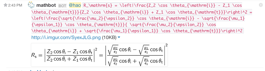 This is what you see if you set up the Slack integration and then type /math R_\mathrm{s} = \left|\frac{Z_2 \cos \theta_{\mathrm{i}} - Z_1 \cos \theta_{\mathrm{t}}}{Z_2 \cos \theta_{\mathrm{i}} + Z_1 \cos \theta_{\mathrm{t}}}\right|^2 = \left|\frac{\sqrt{\frac{\mu_2}{\epsilon_2}} \cos \theta_{\mathrm{i}} - \sqrt{\frac{\mu_1}{\epsilon_1}} \cos \theta_{\mathrm{t}}}{ \sqrt{\frac{\mu_2}{\epsilon_2}} \cos \theta_{\mathrm{i}} + \sqrt{\frac{\mu_1}{\epsilon_1}} \cos \theta_{\mathrm{t}}}\right|^2.