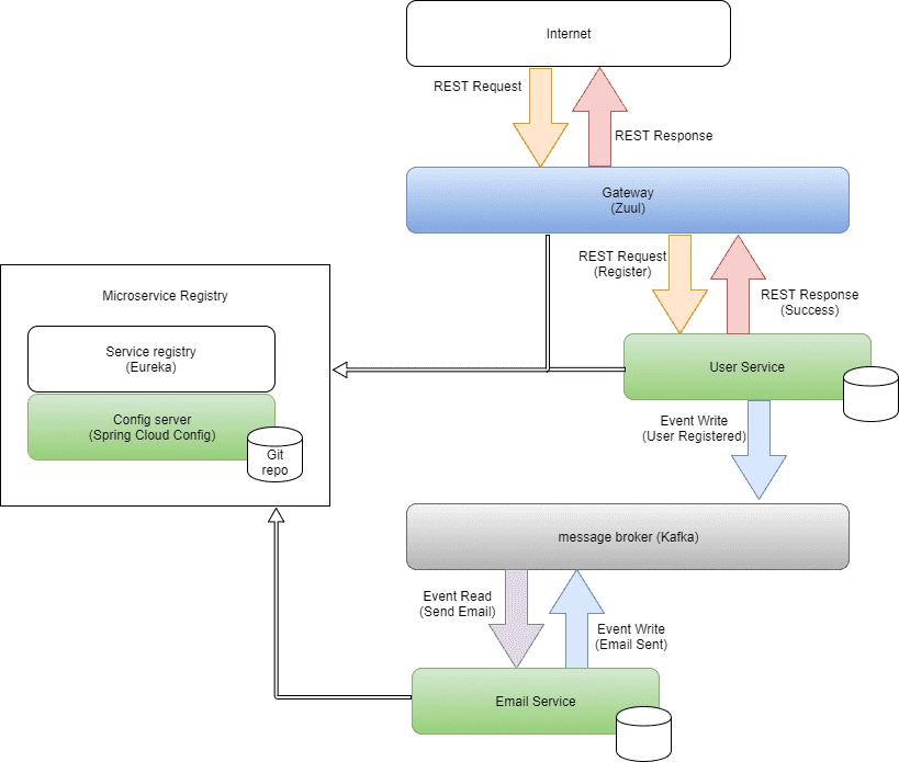 Here is my source code java for application send email to new user register. I used spring ecosystem, Netflix OSS, discovery Eureka server, Apache Kafka and Spring Cloud Gateway.