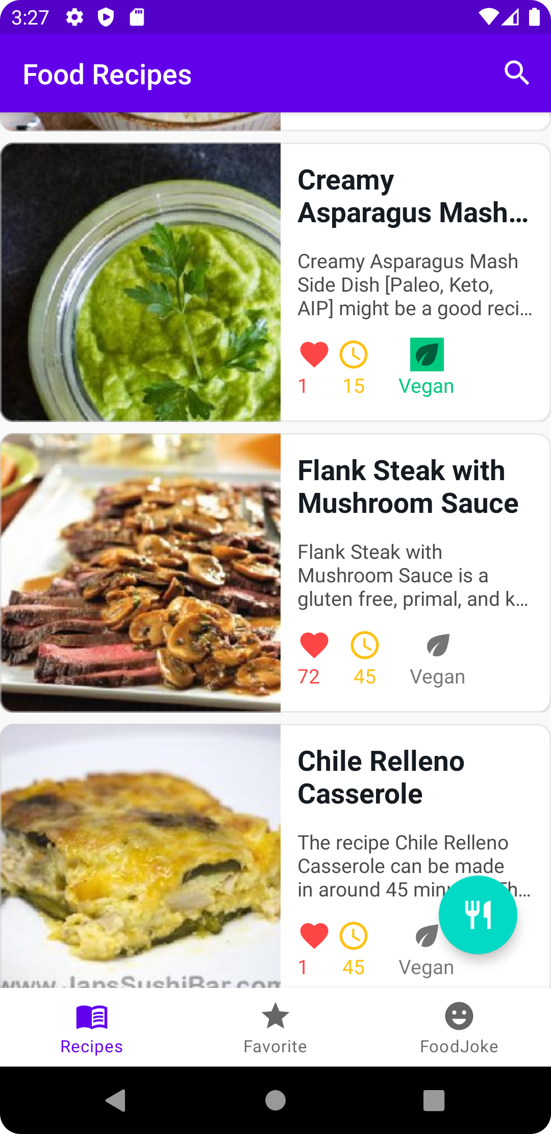 Also from the application we can search recipes directly from our API. So if you have your favorite flavor, you can search for it here and you will probably find a lot of amazing recipes. It will also have Favorites Fragment where we can save our favorite recipes to use later when we need them. And finally the app will have its fun side, and that's a food joke snippet.