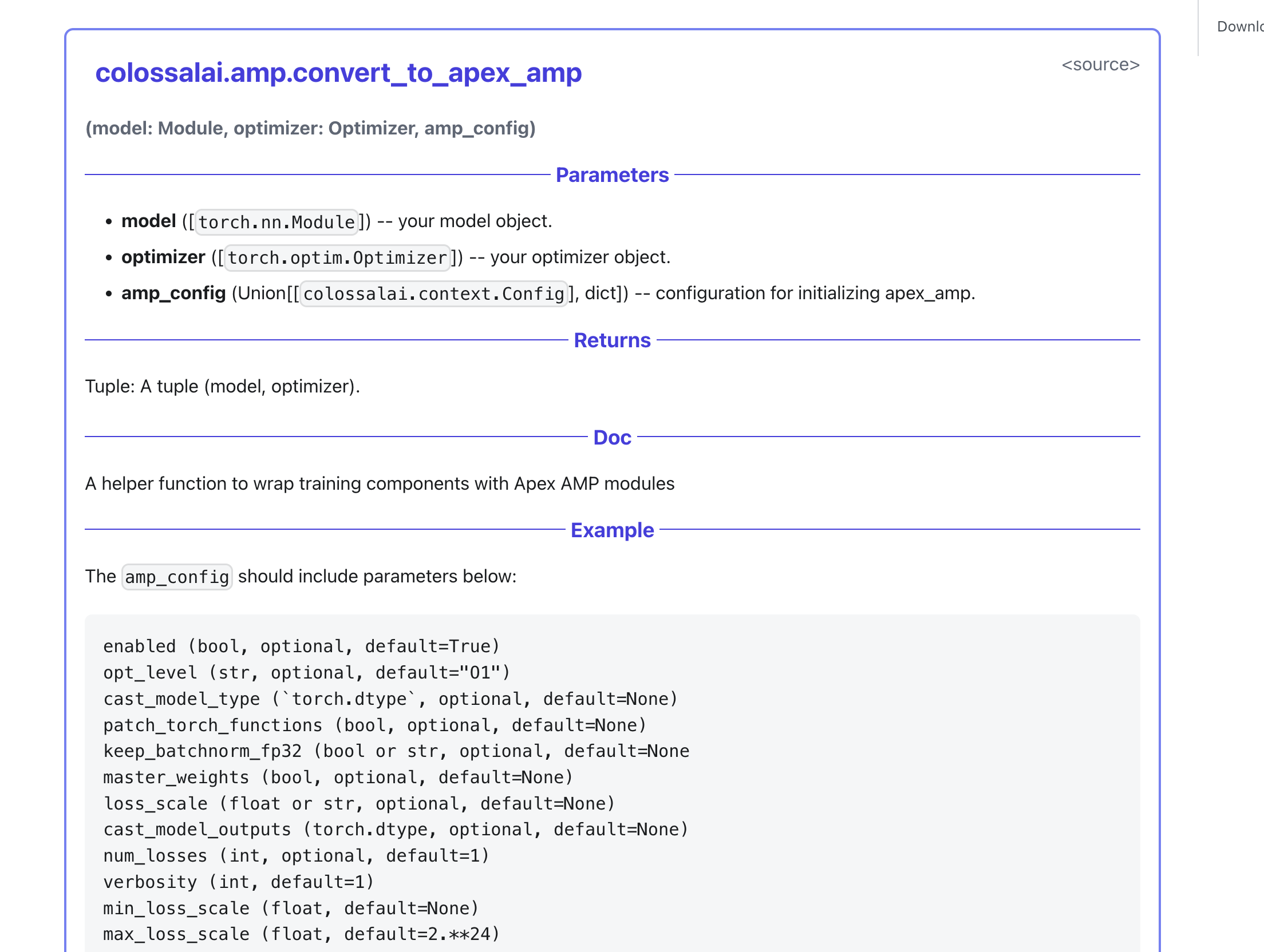 {{ autodoc:colossalai.amp.apex_amp.convert_to_apex_amp }}in his markdown files and this will be converted to React code for its docstring in MDX.