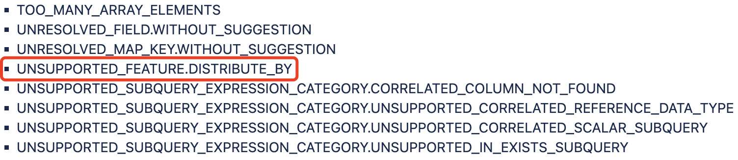 …URE.DISTRIBUTE_BY ### What changes were proposed in this pull request? The pr aims to remove non-existent error class: UNSUPPORTED_FEATURE.DISTRIBUTE_BY. ### Why are the changes needed? When I want to add UT for error class: UNSUPPORTED_FEATURE.DISTRIBUTE_BY, I found it no longer in use. <img width="752" alt="image" src="https://user-images.githubusercontent.com/15246973/210191953-7d896bd7-b552-4a7e-bda8-72237c25297d.png"> ### Does this PR introduce _any_ user-facing change? No. ### How was this patch tested? Pass GA. Closes #39335 from panbingkun/SPARK-41807. Authored-by: panbingkun <pbk1982@gmail.com> Signed-off-by: Max Gekk <max.gekk@gmail.com>