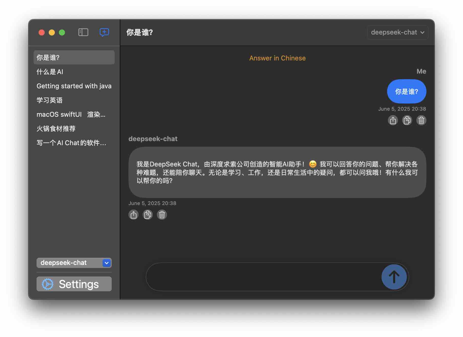 iChat is an intelligent chat tool that supports DeepSeek, Gemini, Grok, OpenAI, and custom AI providers. Developed with SwiftUI and SwiftData, it is a native macOS AI client application.