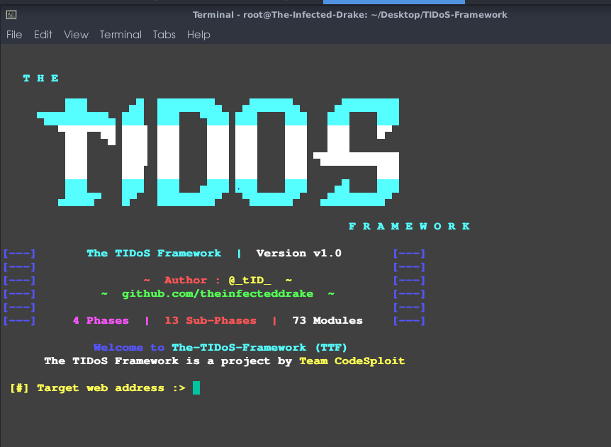 As the framework opens up, enter the website name eg. http://www.example.com and let TIDoS lead you. Thats it! Its as easy as that.