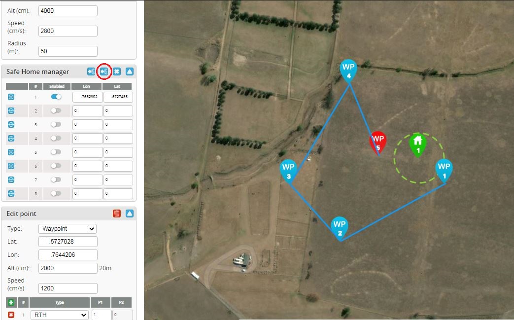 @Jetrell What makes you think WP5 above will go to the Safehome ? I can't see anything in Mission Control that sets this. It's just a WP set to RTH which means it will go back to where the arming point was, not the Safehome. It'll only go to the Safehome on failsafe or if the Safehome RTH setting allows. |