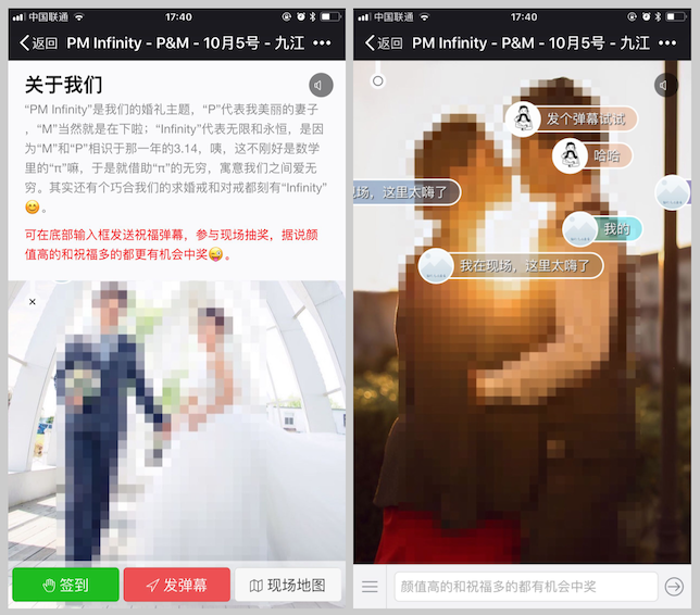 项目分为微信端和大屏端。微信端可以作为电子请柬提前分享给大家,部署的服务器域名最好有备案,不然容易被屏蔽。大屏端是放在婚礼现场的大屏幕上,现场的宾客可以刷弹幕上墙,并且有照片播放页,迎宾页,抽奖页面。另外微信端也作为现场互动的入口,扫码签到可参与抽奖,发弹幕送祝福上大屏幕。