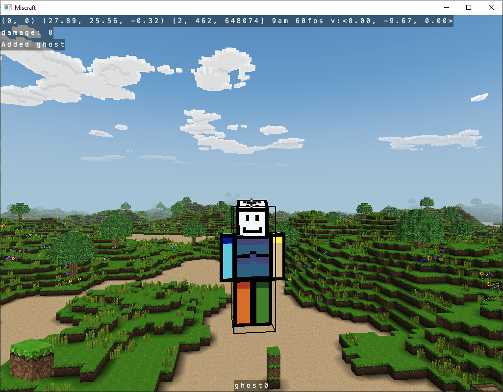 Multiplayer mode is implemented using plain-old sockets. A simple, ASCII, line-based protocol is used. Each line is made up of a command code and zero or more comma-separated arguments. The client requests chunks from the server with a simple command: C,p,q,key. “C” means “Chunk” and (p, q) identifies the chunk. The key is used for caching - the server will only send block updates that have been performed since the client last asked for that chunk. Block updates (in realtime or as part of a chunk request) are sent to the client in the format: B,p,q,x,y,z,w. After sending all of the blocks for a requested chunk, the server will send an updated cache key in the format: K,p,q,key. The client will store this key and use it the next time it needs to ask for that chunk. Player positions are sent in the format: P,pid,x,y,z,rx,ry. The pid is the player ID and the rx and ry values indicate the player’s rotation in two different axes. The client interpolates player positions from the past two position updates for smoother animation. The client sends its position to the server at most every 0.1 seconds (less if not moving).