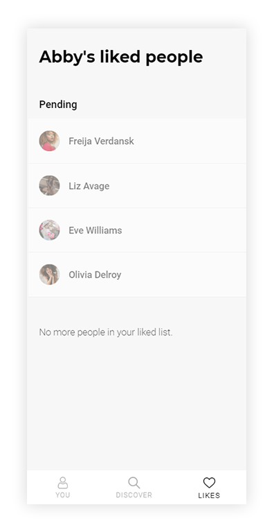 When the user sees someone who interests him, they can press the like button. The other person appears on the 'liked' page: if the other user hasn't liked our user yet, in the 'pending' section. If it's a mutual like, in the 'matches' section.