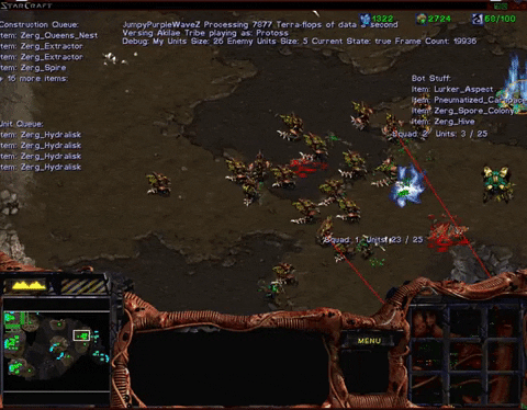 - There is a known bug that the bot forgets where the enemy is and scouts around the map. This can work in my favour as it sometimes targets last stored attack position which is often enemy bases. So for now it's a Feature