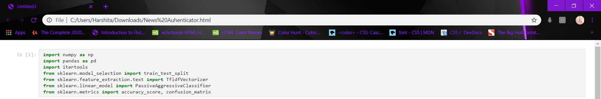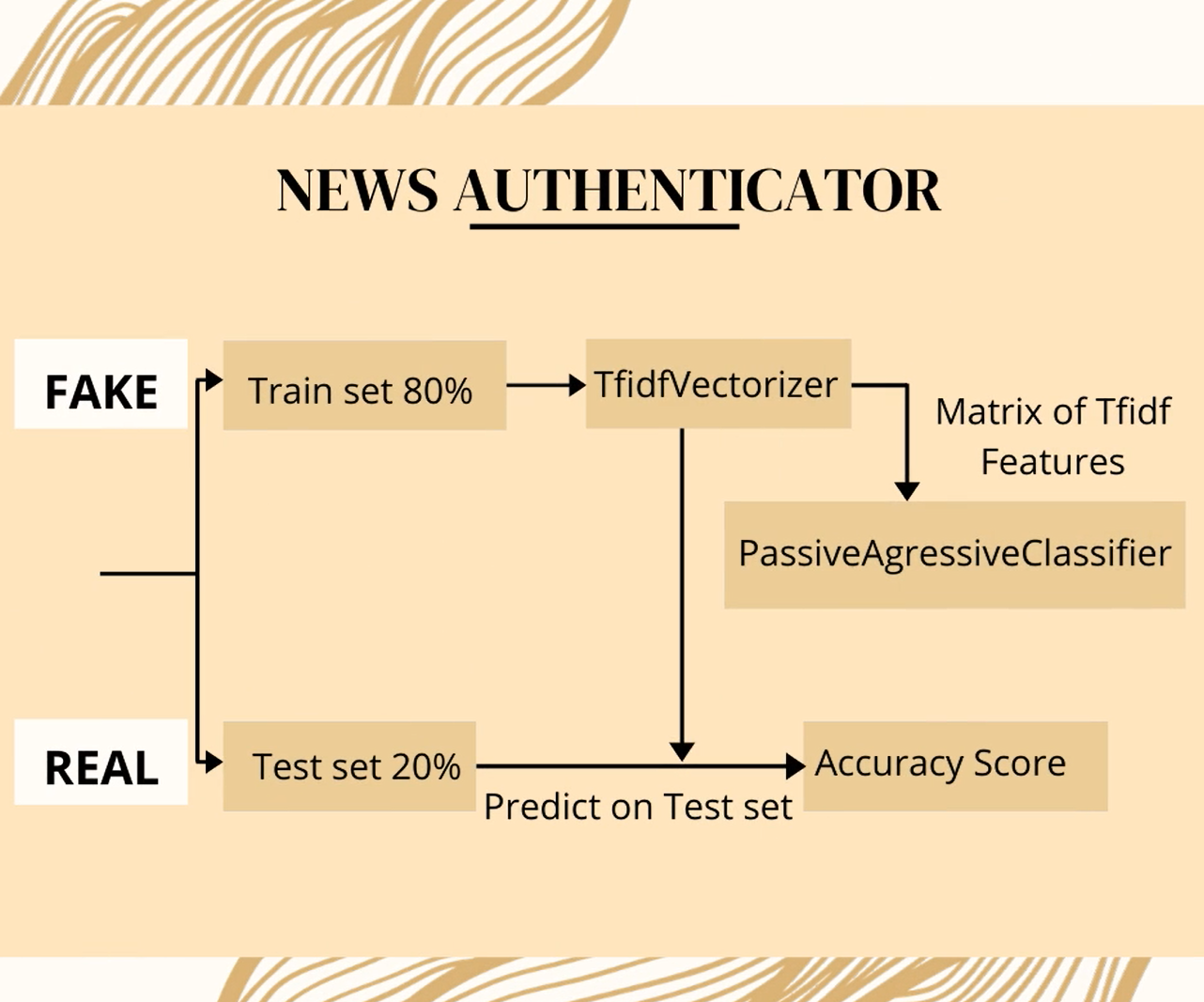 This python project of news authenticator deals with fake news and real news. Using sklearn (scikit), we build a TfidfVisualizer on our dataset. Then, we initialize a PassiveAgressive Classifier and fit the model. In the end, the accuracy score and the confusion matrix tell us how well our model fares.