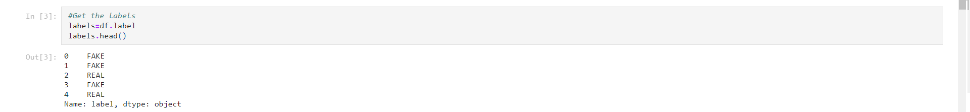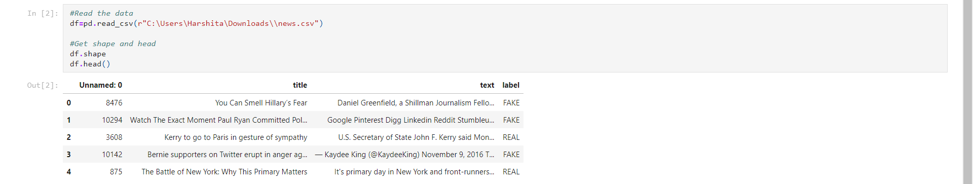 The dataset we've used for this python project is news.csv. This dataset has a shape of 7796x4. The first column identifies the news, the second and third are the title and text, and the fourth column has labels denoting whether the news is REAL or FAKE.