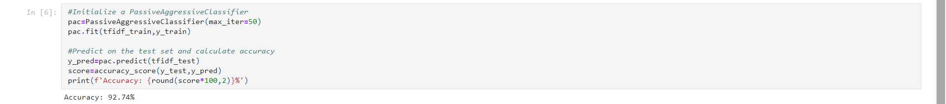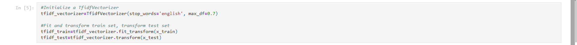 Next, we’ll initialize a PassiveAggressiveClassifier. That is we’ll fit this on tfidf_train and y_train.