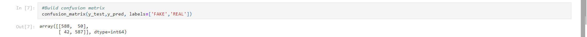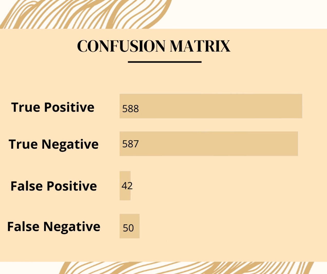 So with this model, we have 588 true positives, 587 true negatives, 42 false positives, and 50 false negatives. We took a political dataset, implemented a TfidfVectorizer, initialized a PassiveAggressiveClassifier, and fit our model. We ended up obtaining an accuracy of 92.74% in magnitude.