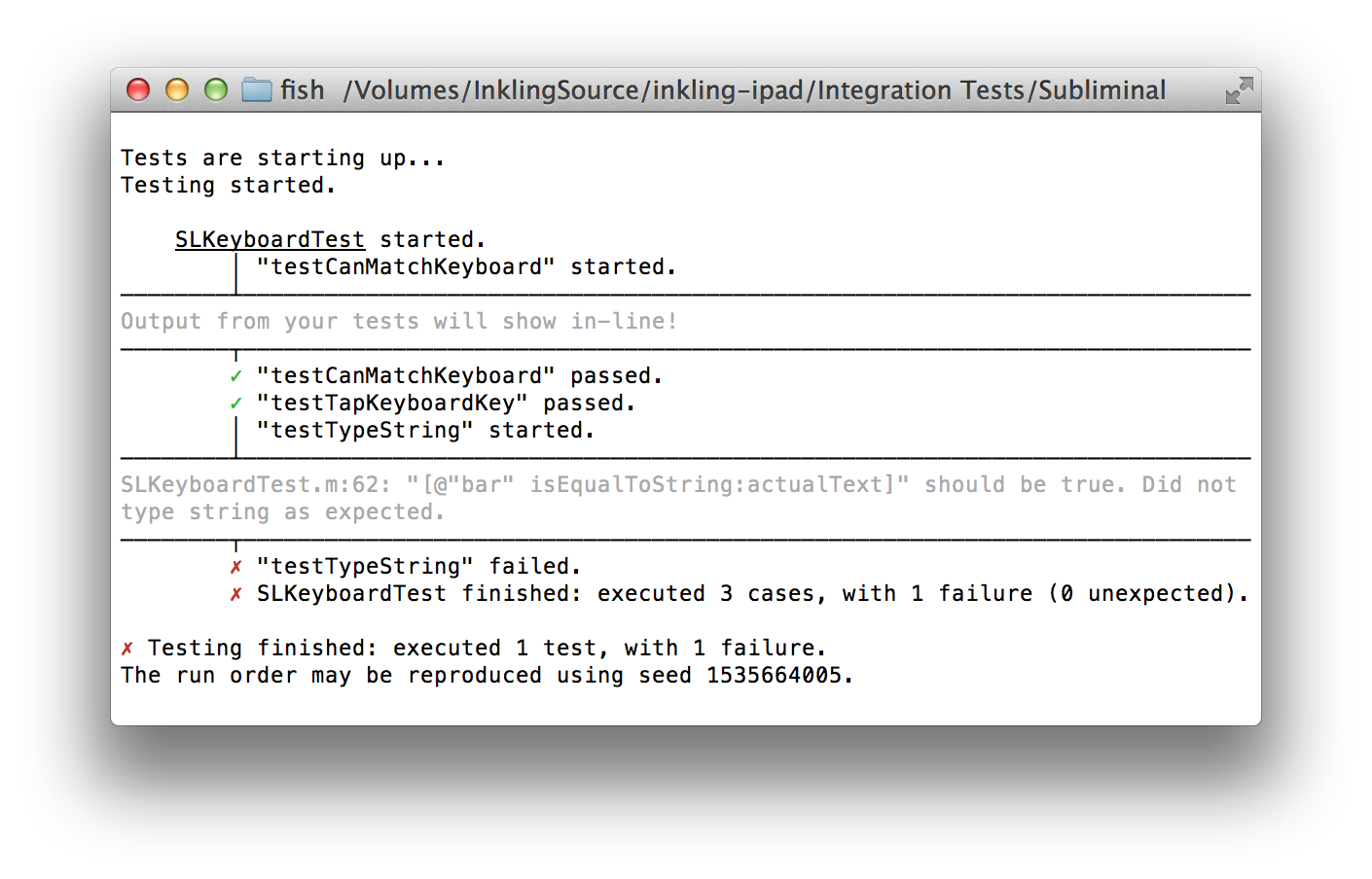 . - Switch to the "Integration Tests" scheme. You may also see a scheme called "Subliminal Integration tests"--make sure you choose "Integration Tests."