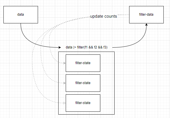 Histogram in RangeFilterState, or bars in the ChoicesFilterState, etc. base now on unfiltered data. Which means That if somebody adds (for example) SEX filter it always displays the same numbers of observations for M, F, U and NA. The point is to rerender these values based on the state of the filtered-data. This will help users to follow what exactly remains after applying other filters.