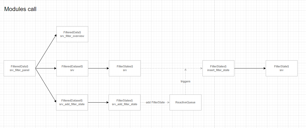 Tip: this will require passing filtered-data (reactive) to the srv_filter_panel and pass it down to the place where FilterState is initialized (FilteredData$srv_filter_panel > FilteredDataset[i]$srv_add_filter_state > FilterStates[i]$srv_add_filter_state > init_filter_state). In the image below I present how srv modules are called withing filter-panel classes. FilteredData$filter_panel_srv calls three modules which can be seen in the filter-panel as "Summary", "Active filters", "Add filter". In the beginning active filters (srv) are empty and new filters can be added through srv_add. When new filter is selected then a new FIlterState is created and pushed to the ReactiveQueue. FIlterStates$srv detects that a new FilterState has been added and calls insert_filter_state_ui which calls FilterState$ui and FilterState$srv modules.