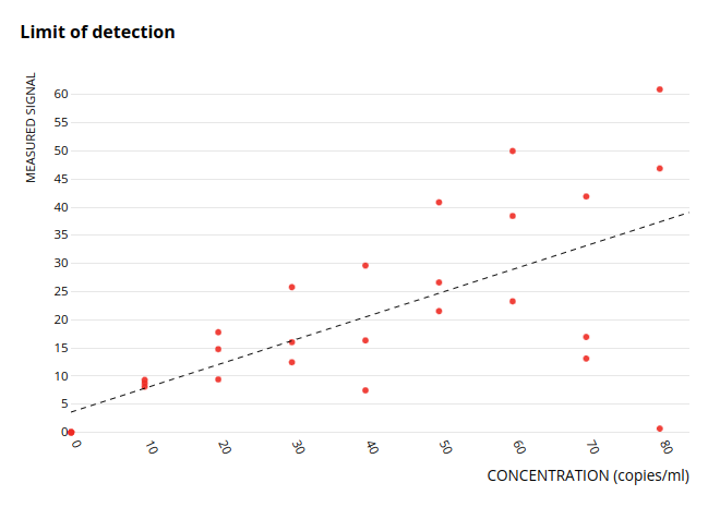 LODpurpose and looks different attending client request: each sample has a concentration and a measured signal and represents a point in the plot, the regression line computed for all these points is represented with a dashed line.Challengepurpose. The curve itself is displayed in red, and the TPR and FPR of the selected threshold are updated to accommodate the dashed lines.The
