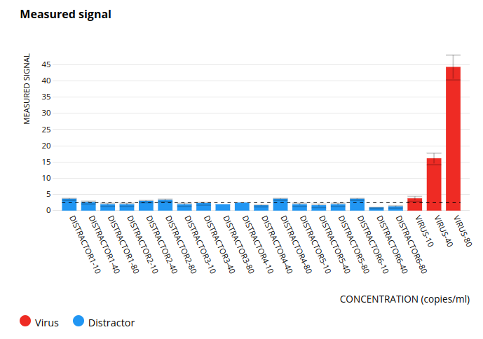 Variants&LODand in the case ofChallengehave two differences: distractor samples are grouped in blue bars and virus ones are kept in red, and there is a line to indicate thethreshold.For LOD: