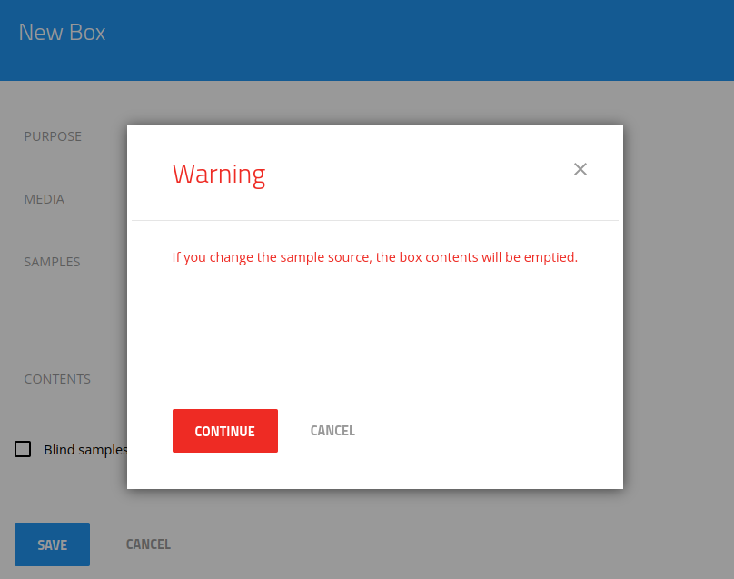 When the source of samples in box creation is changed, a warning message is shown: