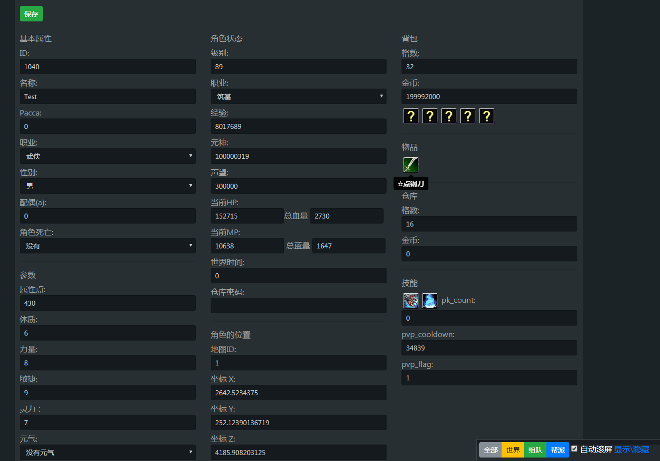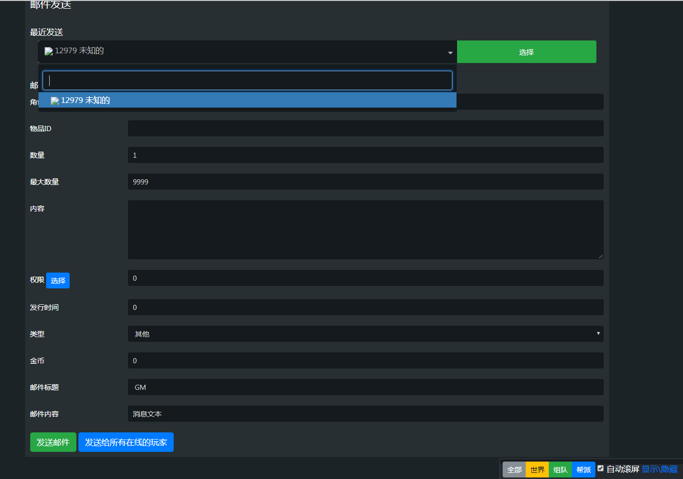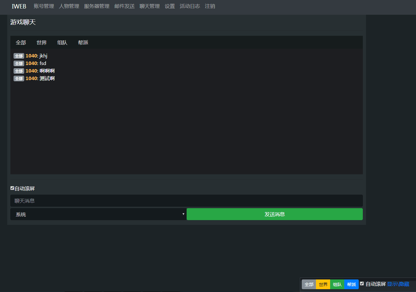 - 实时查看聊天信息(包括号角,国家,组队,帮派,附近以及跨服等都有),并且全局滚屏聊天内容