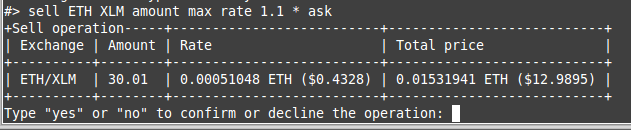 When placing orders, there's some constants you can use to express quantities and rates at which you want to buy/sell. For example, if you wanted to sell all your Ethereum for Bitcoin but only when the price of BTC/ETH is 10% higher than the current sell price, you can do: