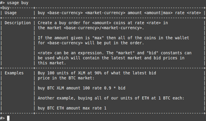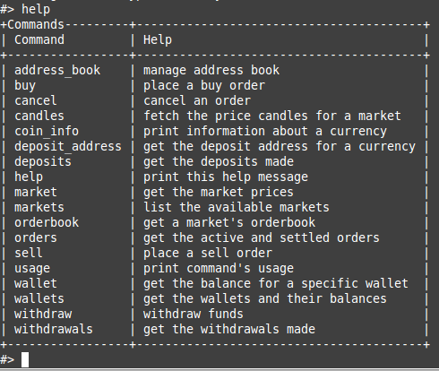 The shell-like interface makes it easy to place orders, jump between different markets, see historic prices, etc. This uses GNU readline under the hood to provide parameter autocompletion and command history so performing any actions is quick and easy.