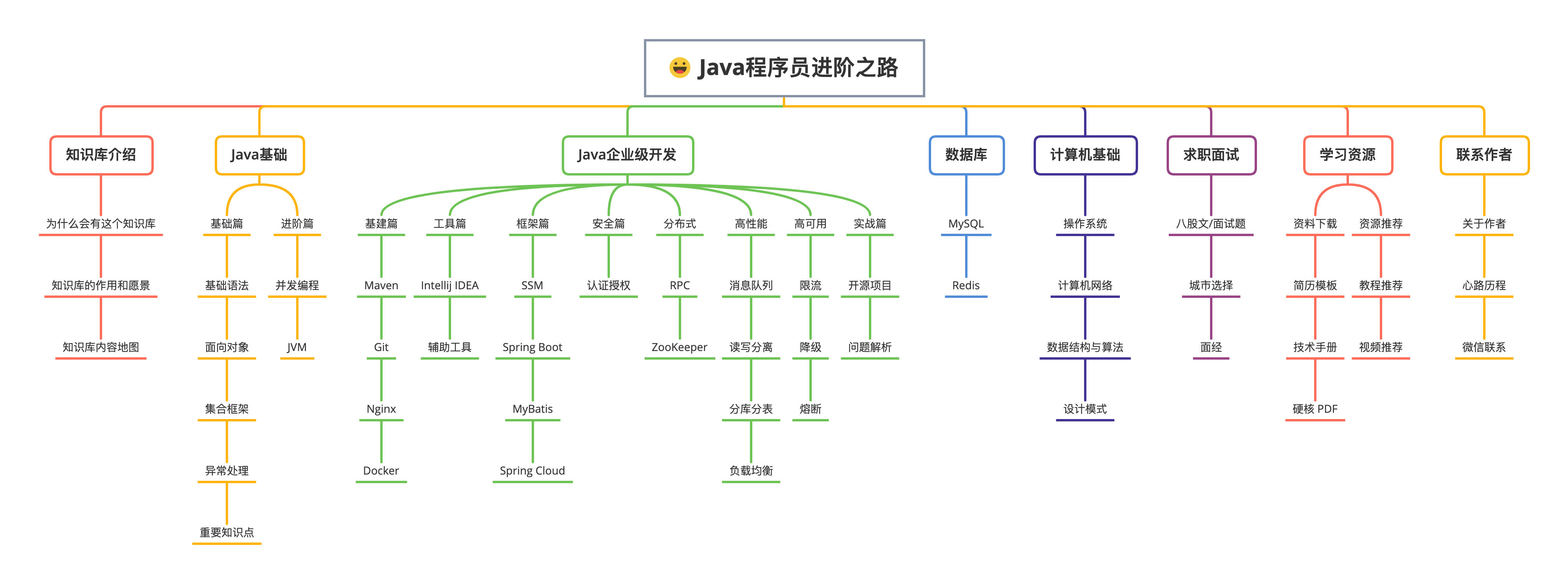 知识库收录的核心内容就全在这里面了,大类分为 Java 核心、Java 企业级开发、数据库、计算机基础、求职面试、学习资源、程序人生,几乎你需要的这里都有。