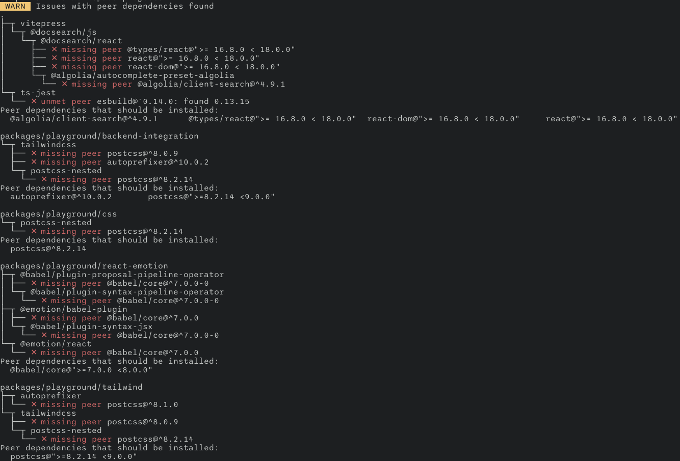 Peer dependency issues are grouped and rendered in a nice hierarchy view.
