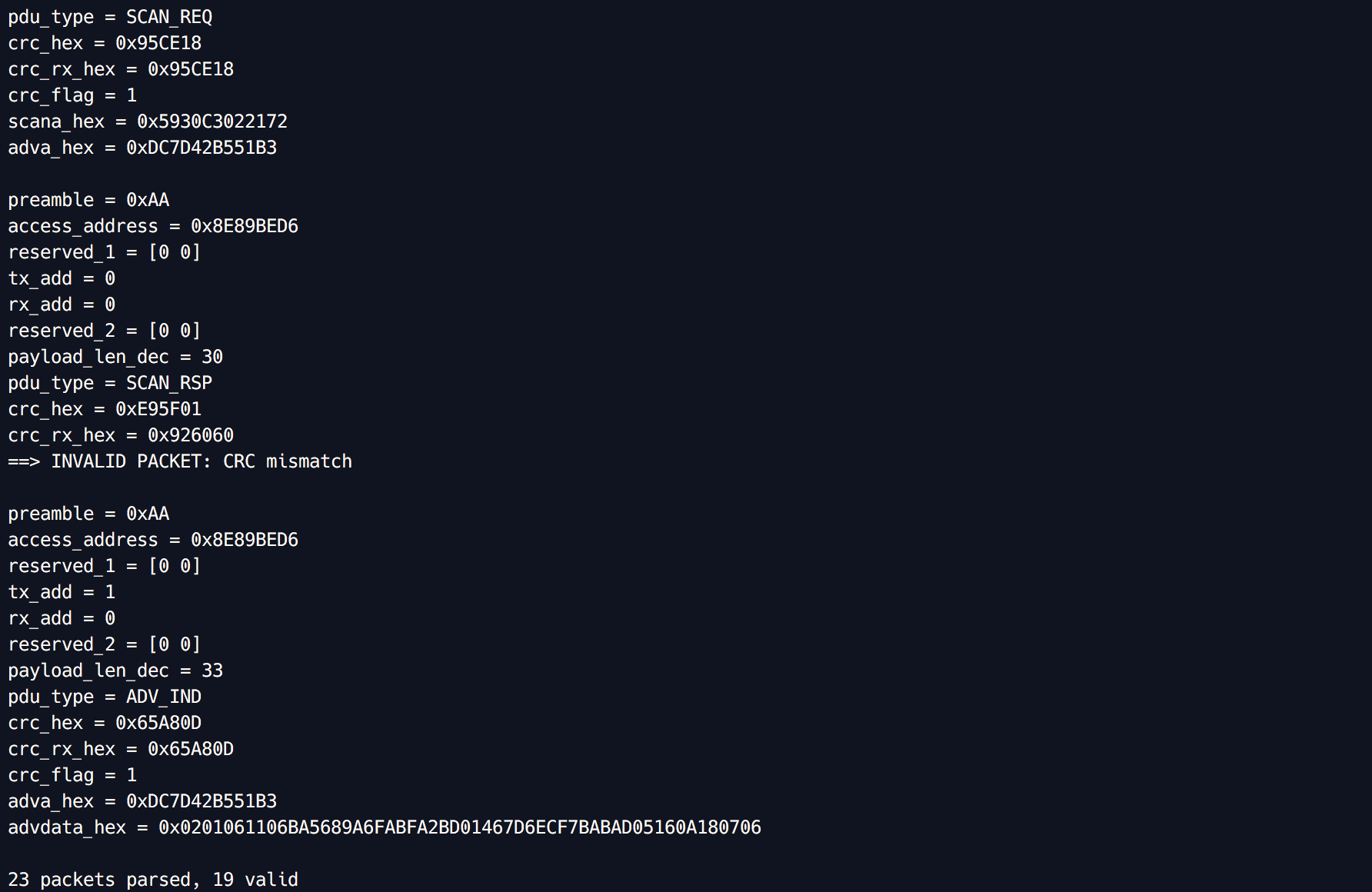 This code finds and parses Bluetooth Low Energy packets from raw channel traffic, written in Octave1 for security research at the Hume Center at Virginia Tech.