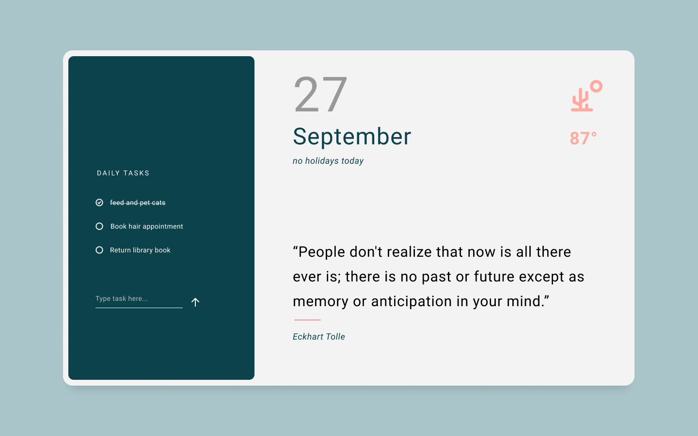 simple productivity Dashboard that displays the locatl weather temperature, local weather condition, daily holidays, date, and a daily inspirational quote. Paired with a task list on the left-hand side.