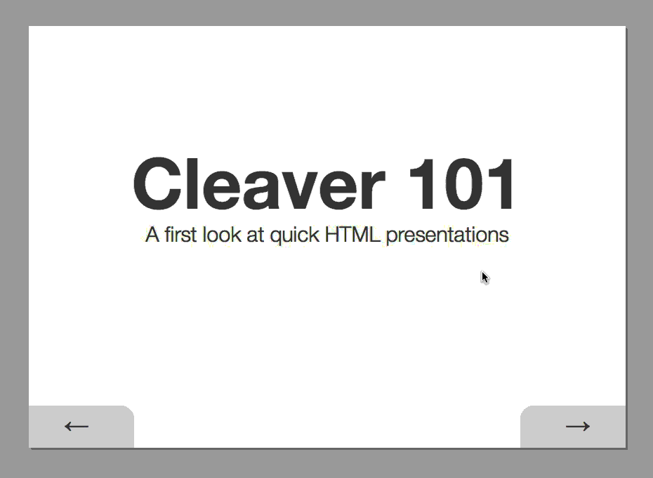 Cleaver is a one-stop shop for generating HTML presentations in record time. Using some spiced up markdown, you can produce good-looking, interactive presentations without writing any code or placing a measly textbox.
