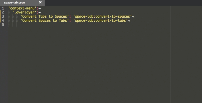 space-tab package Changes all leading tabs to spaces, or all leading spaces to tabs Usage Bring up the command palate and search for Space Tab: Convert to Tabs or Space Tab: Convert to Spaces or ctrl + alt + ] converts spaces to tabs ctrl + alt + [ converts tabs to spaces
