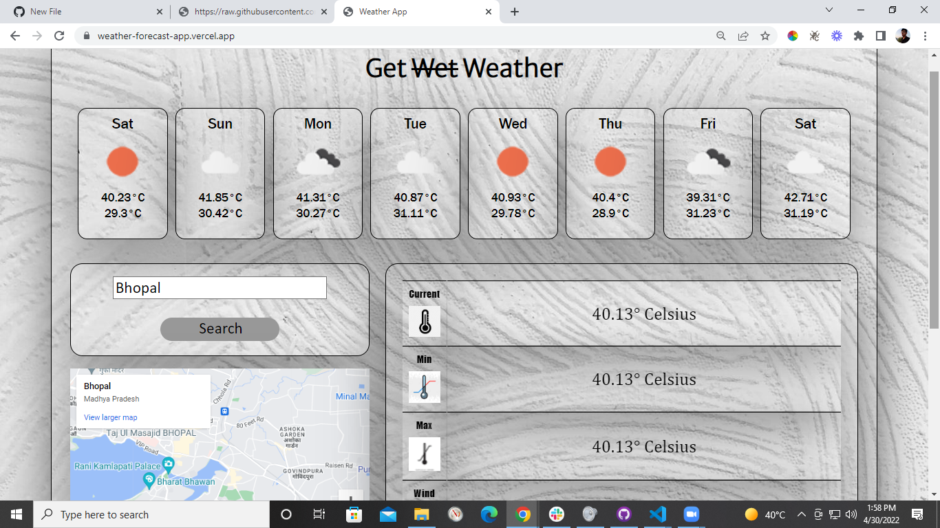 This is a project I made during my third month of my Bootcamp (Masai School). It is a weather forecast app that will fetch the weather of any location in the world asked by the user. It will tell current weather report with various little details. It will also provide forecast for the next 7 days. I have also integrated the google maps with this app and it will show the location on the map as well.