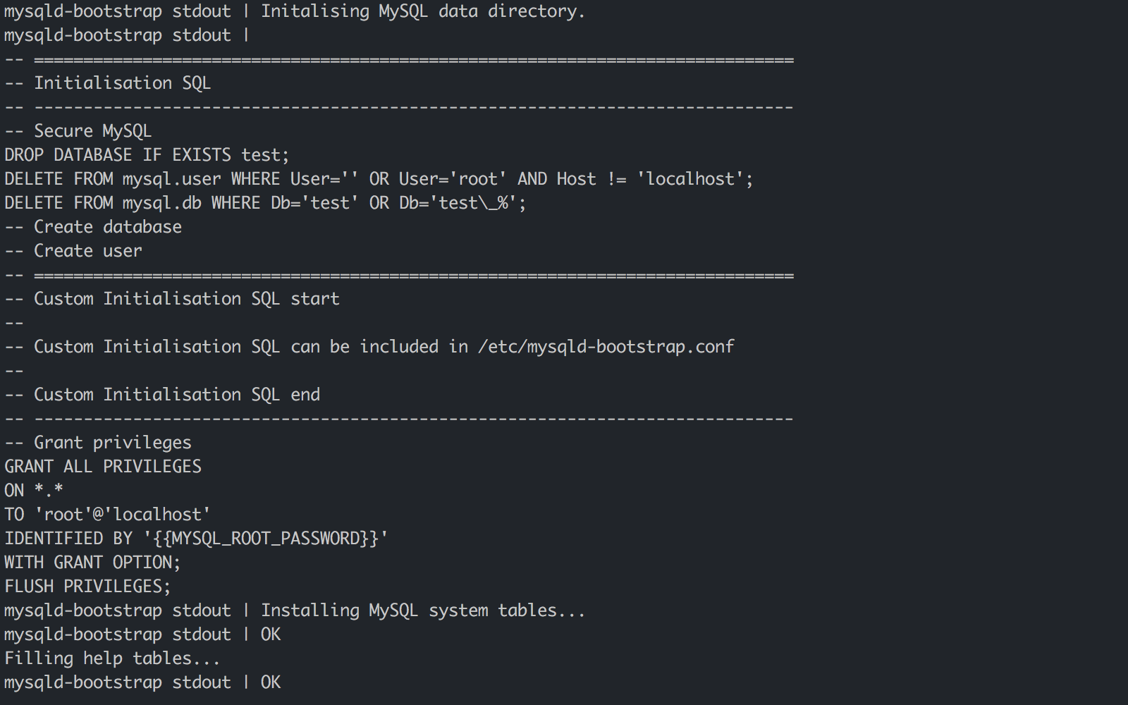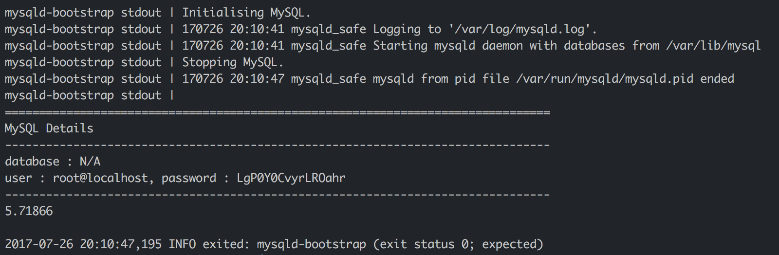 On the first run, there will be additional output showing the initialisation SQL template and, before mysqld-bootstrap completes, the MySQL Details which shows the configured database, if applicable, and any associated user credentials.
