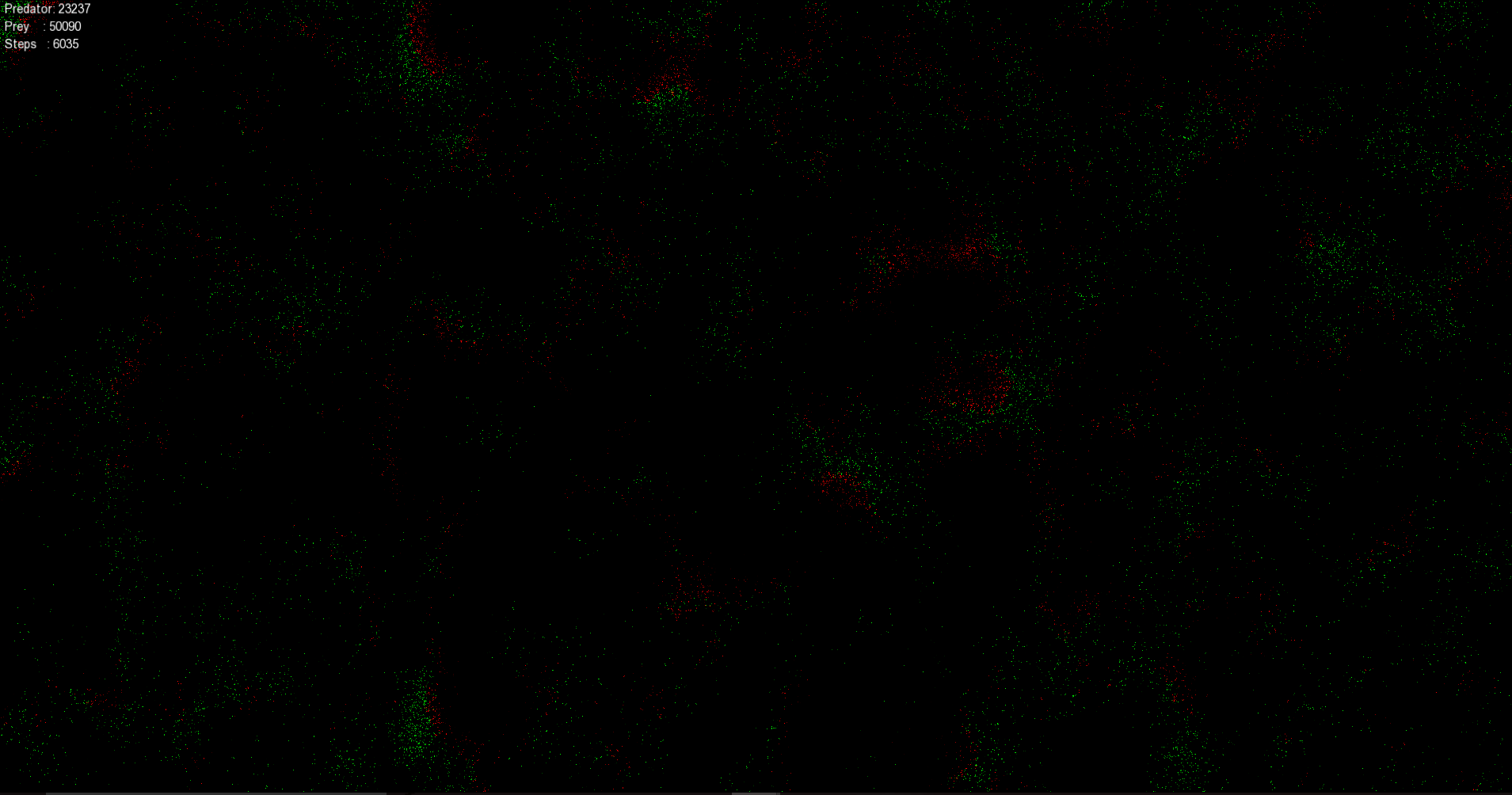 The world is grid of cells, with 3 possibilities: Predator(Red), Prey(Green), or Empty(Black).