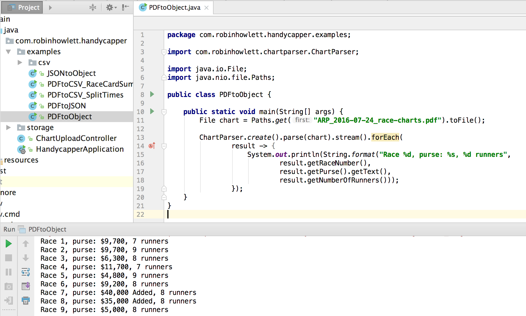 List<RaceResult> raceResults = ChartParser.create().parse(Paths.get("ARP_2016-07-24_race-charts.pdf").toFile());IMPORTANT: This project relies on enabling the Java 8 method parameter reflection feature (-parameters) in your JVM settings e.g.