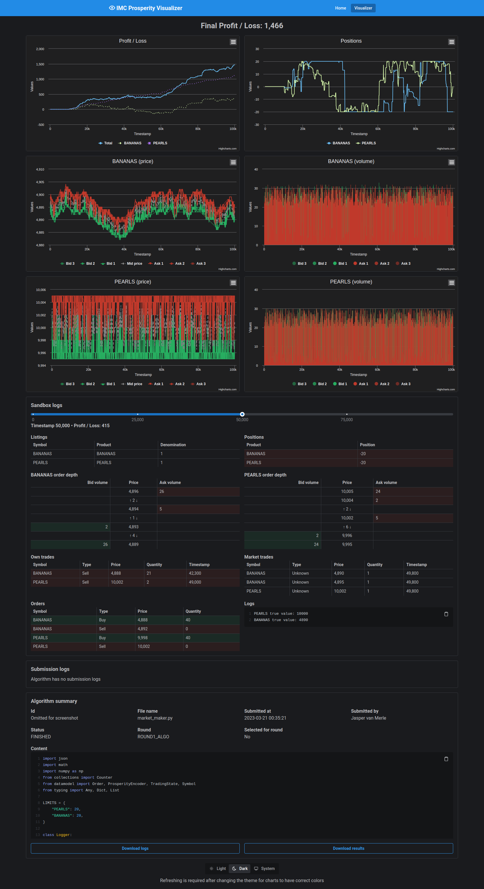Please note that this visualizer only supports IMC Prosperity 1 algorithms. See my IMC Prosperity 2 Visualizer for IMC Prosperity 2 algorithms.