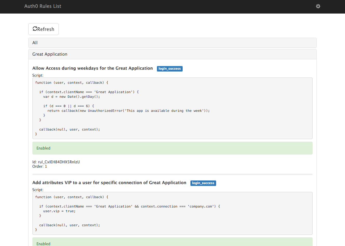 In this repository, you'll find an API and Web Application that can dynamically generate, at any time, a list of the applications in your Auth0 account and the rules which apply to each application.