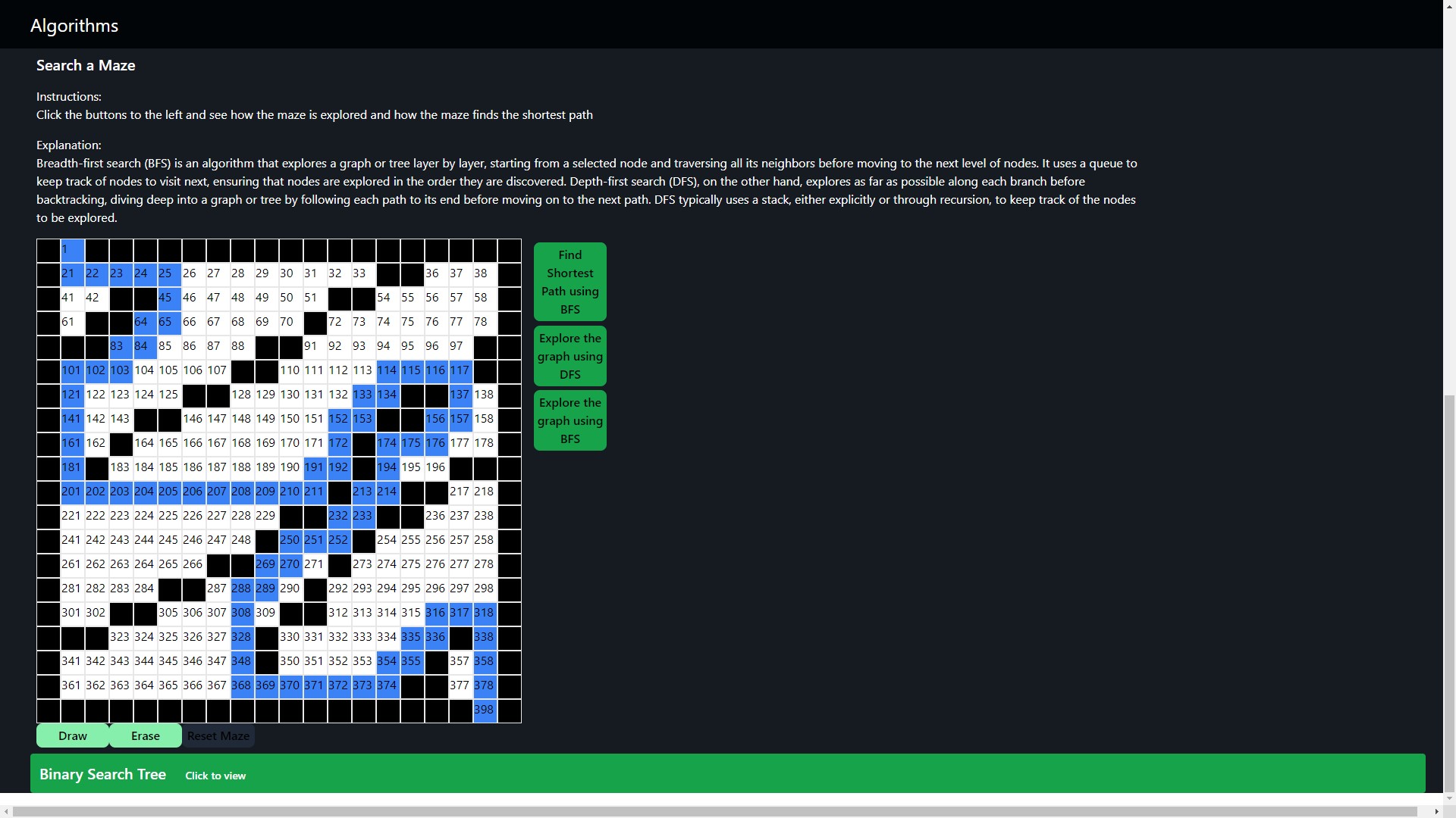 This project is an interactive web-based visualization tool for various algorithms including search algorithms like DFS (Depth-First Search) and BFS (Breadth-First Search), as well as sorting algorithms like Merge Sort, Binary Insertion Sort, Quick Sort, Cocktail Shaker Sort, and LSD Radix Sort.