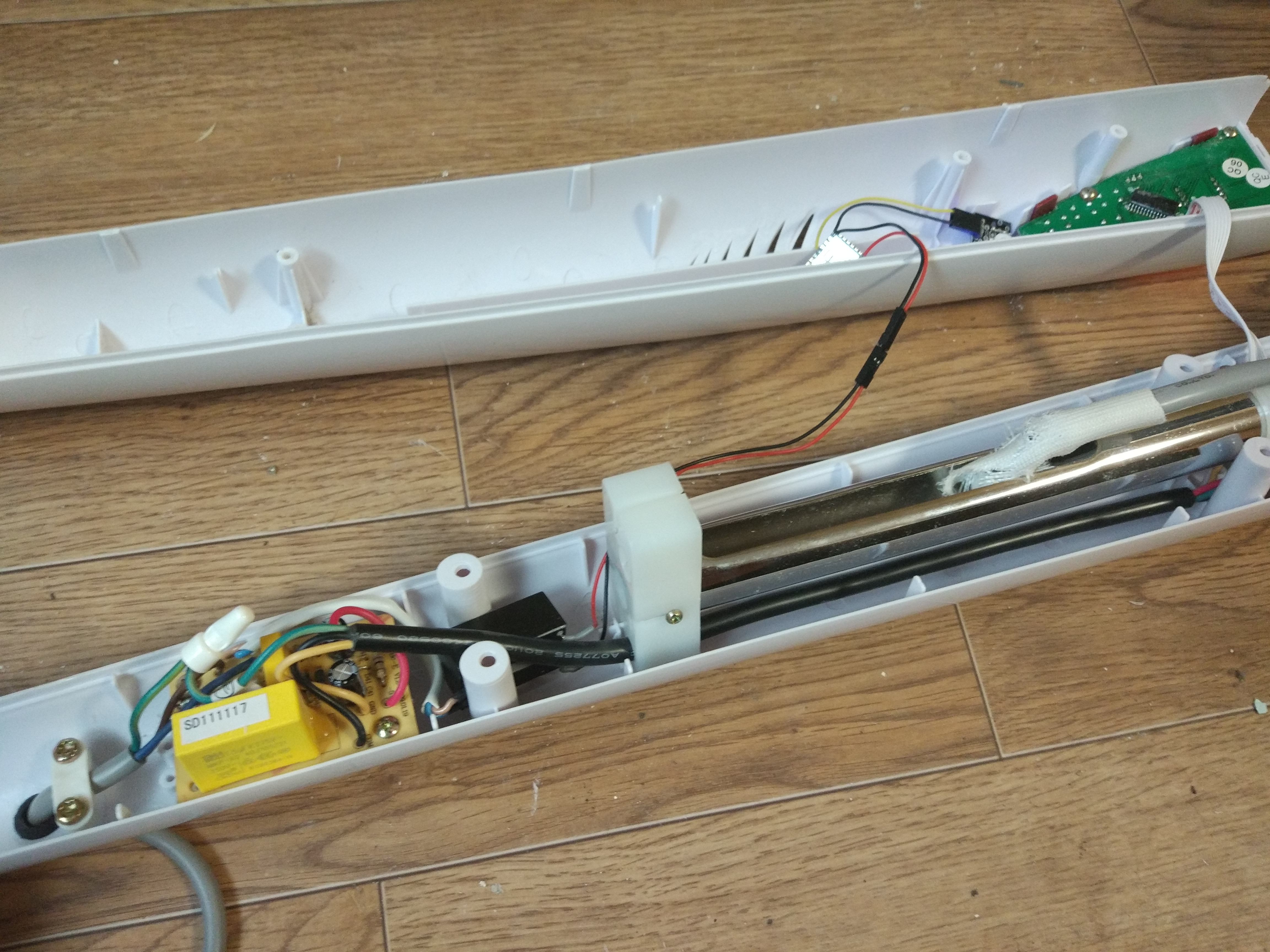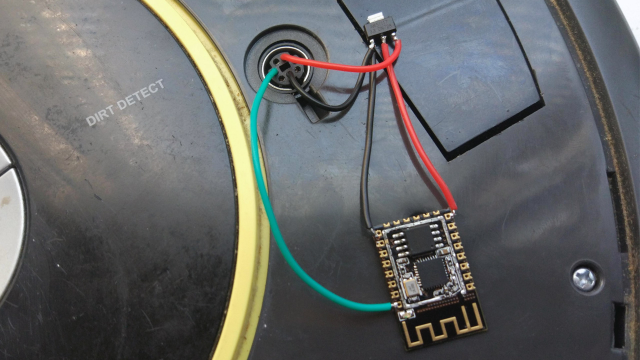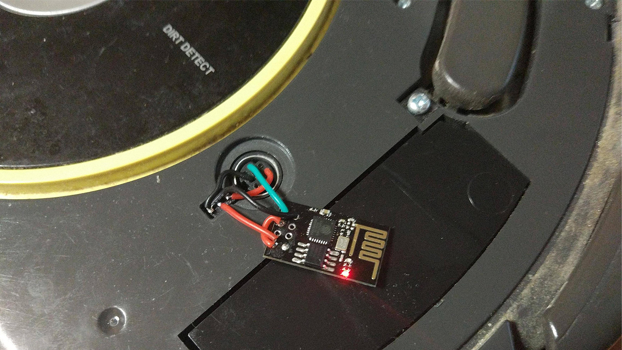 There's also a small project for Roomba 620 (in progress). I tried to utilize IR sender but it didn't work for some reason, so I just used roomba serial port to send commands (you need it for power anyway). The serial port is located under the top cover (it can be lifted with bare hands), some kind of mini-DIN connector (sadly mouse/keyboard PS/2 adapters can't be donors for that, they won't fit). I've used 3.3V regulator and the unshielded ESP-12F module, so it fits under the top cover.