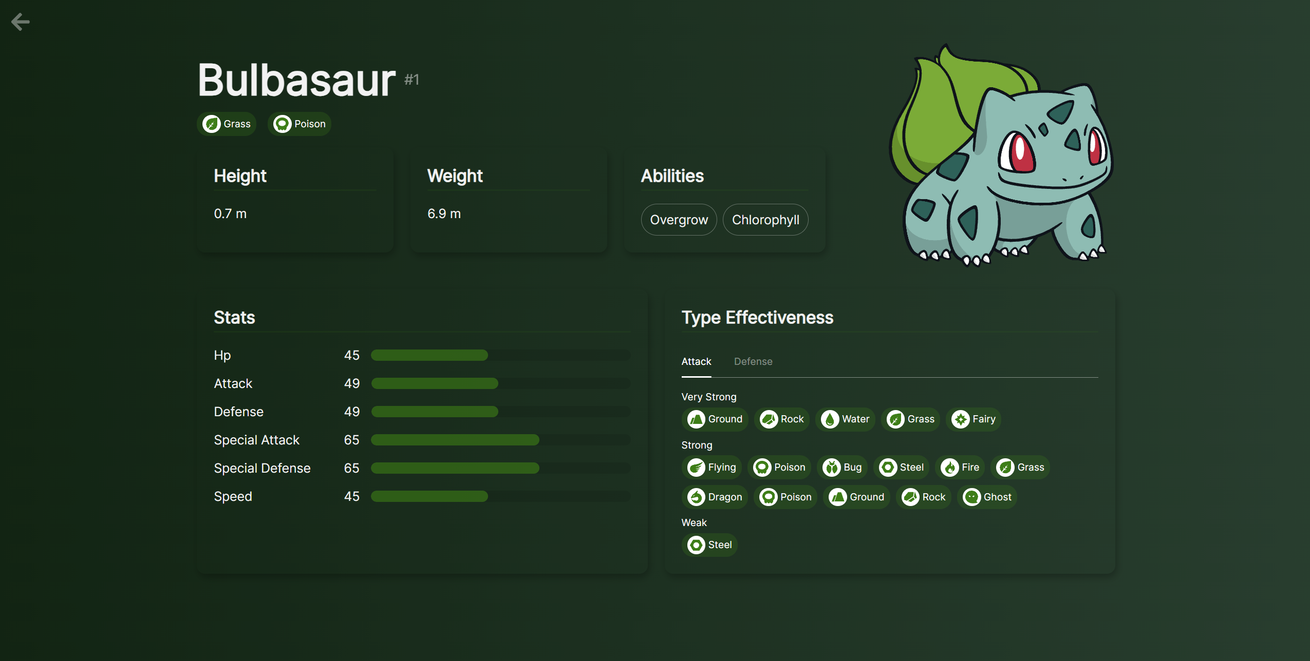 Here you can find a more detailed information about the Pokémon you want. The entire page's color scheme is dynamic and it depends on the Pokémon color type.