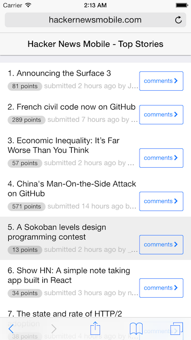hacker-news-mobile Hacker News mobile-friendly web app. Implemented as an 'isomorphic' React application. Uses hacker-news-mobile-api getting started cp config-defaults.json config.json npm run build npm run digest npm start