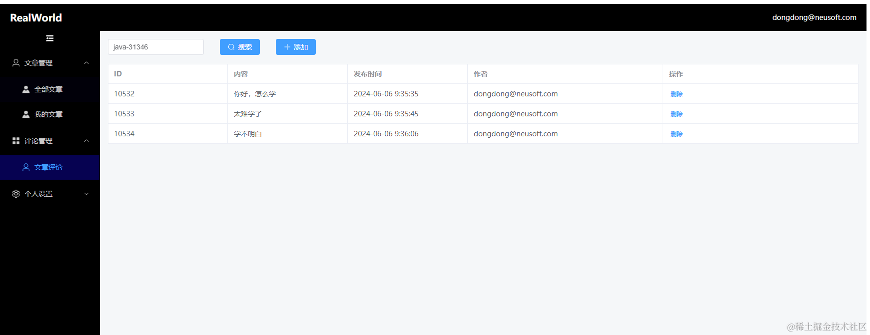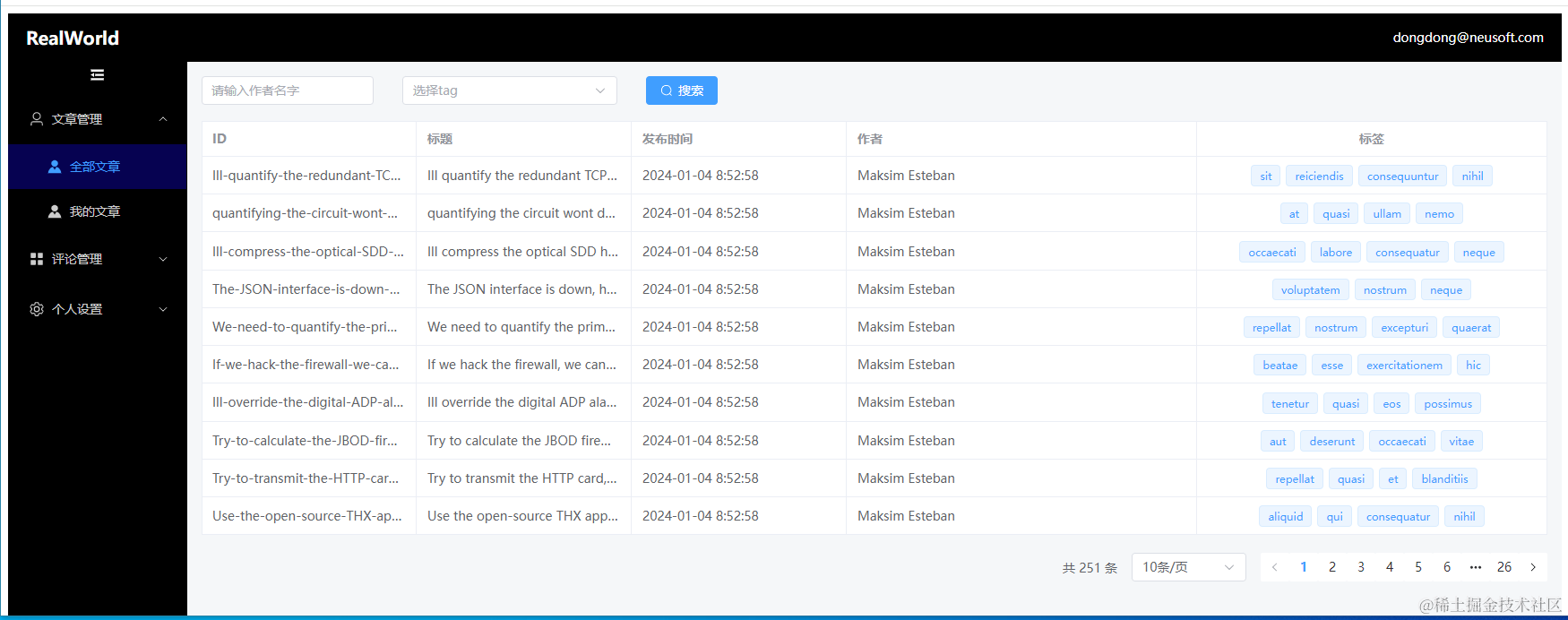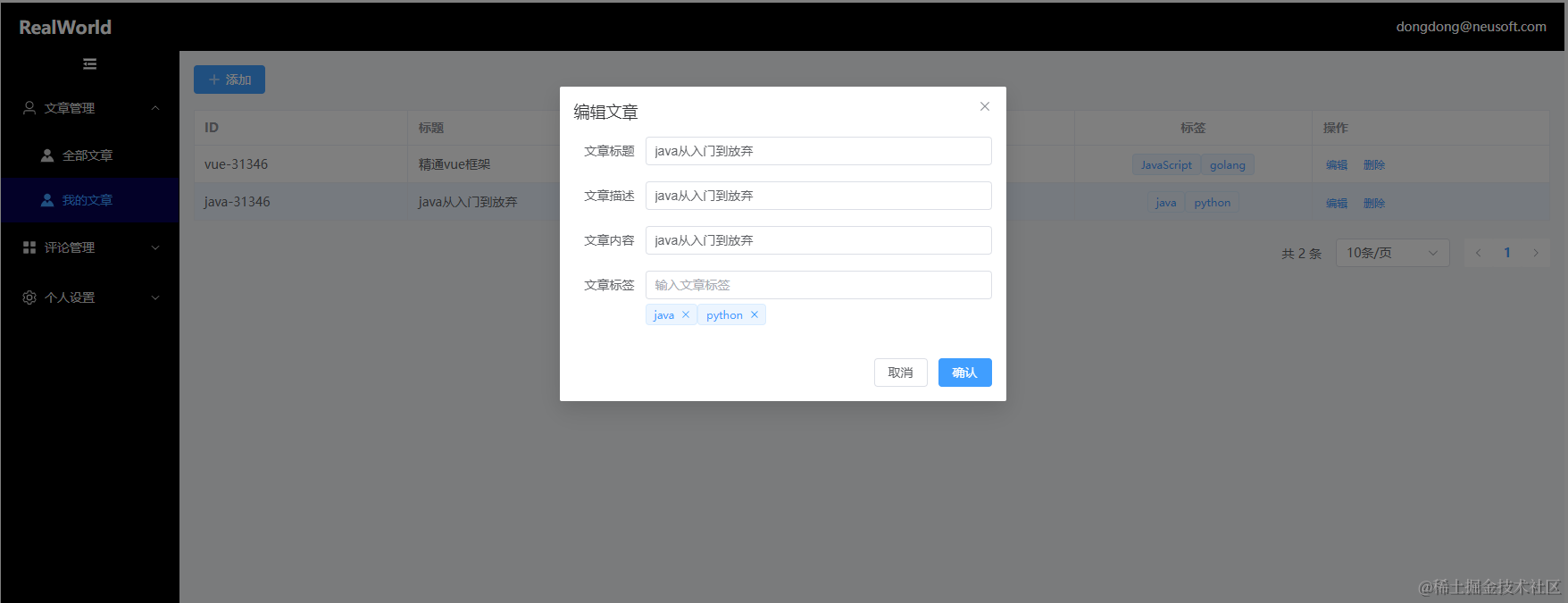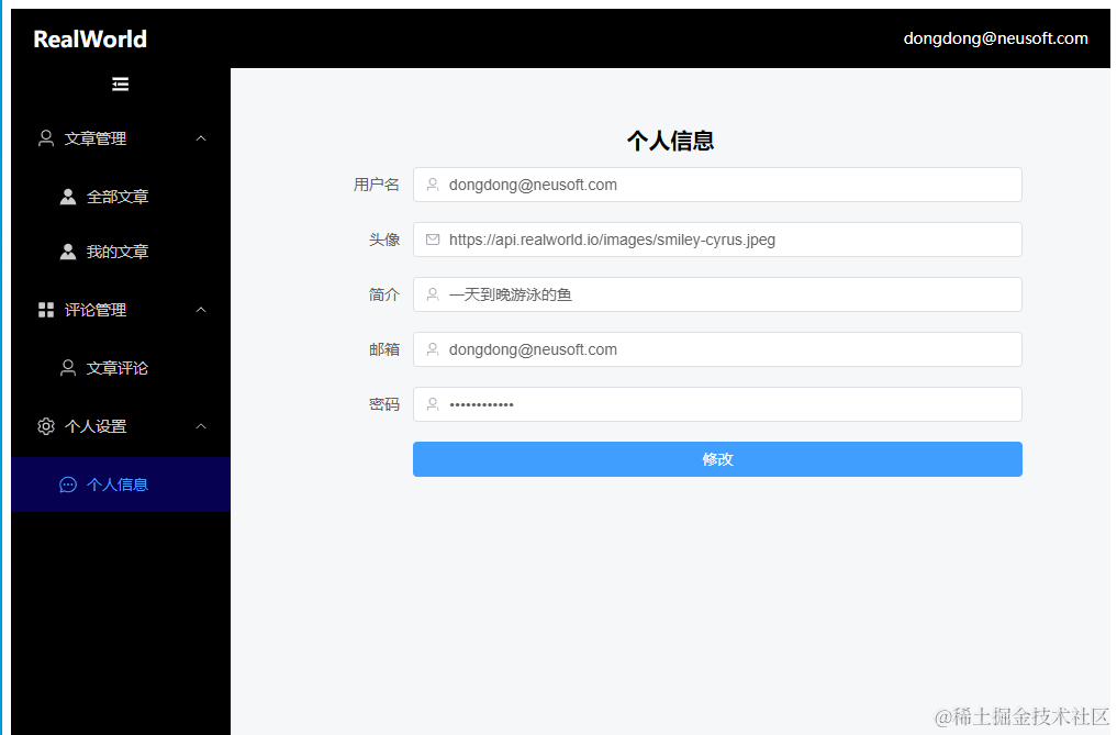 项目使用当前公司中最常用,最流行的Vue3+TypeScript+ElementPlus快速开发框架,基于RealWorld项目的开放接口,从零开始一步一步实现一个用户注册,登录,文章管理,评论管理,个人信息管理等模块的通用后台管理系统雏形。