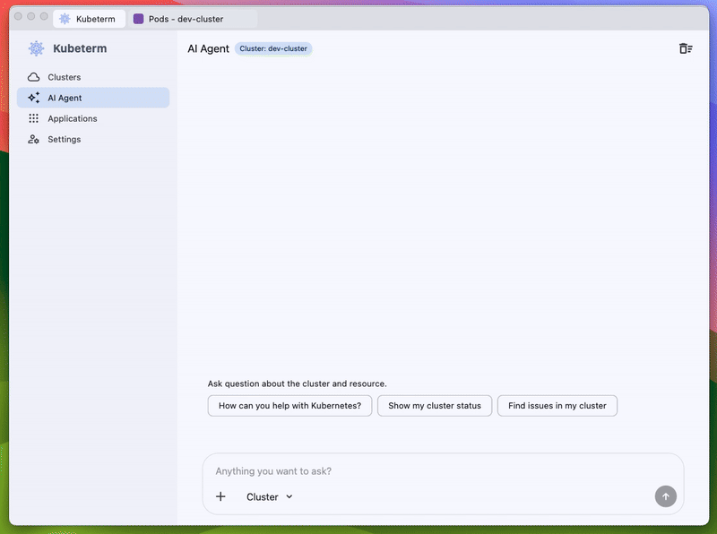 Kubeterm includes a built-in AI Agent for Kubernetes operations and troubleshooting. The agent runs inside Kubeterm, can work with the currently selected cluster or resource context, and helps investigate issues directly from the UI.