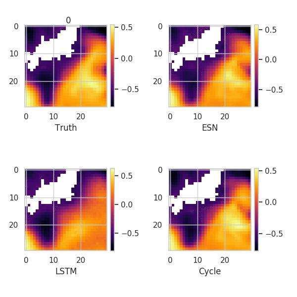 The true evolution of the time series is visible in the top left, the ESN prediction in the top right, LSTM prediction lower left, and the cycle-based prediction in the lower right.