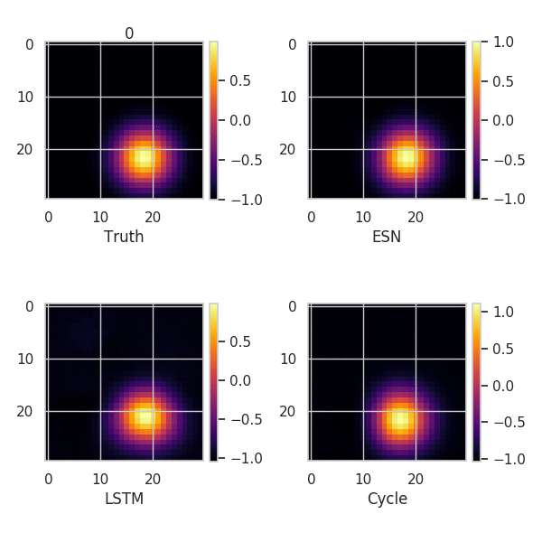 Prediction of a chaotically moving Gaussian blob. The trajectory of the maximum is governed by the Mackey-Glass time series in the x-dimension and a sine in the y-dimension. The true evolution of the time series is visible in the top left, the ESN prediction in the top right, LSTM prediction lower left, and the cycle-based prediction in the lower right.