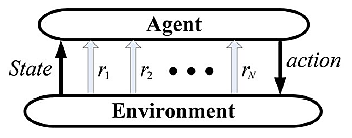 - The agent receives a scalar reward signal that evaluates the effect of this state transition