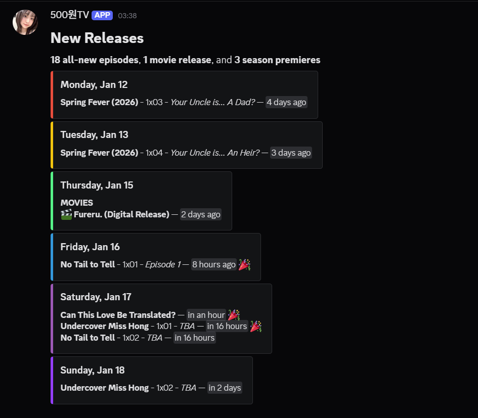 A simple Docker container that fetches upcoming airings/releases for TV shows and movies from Sonarr and Radarr calendars and posts them to Discord on a schedule.